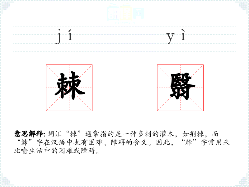 - 理解:“棘”字不仅指具体的植物刺,更常用来比喻生活中的困难和障碍,是一个富有象征意义的词汇。