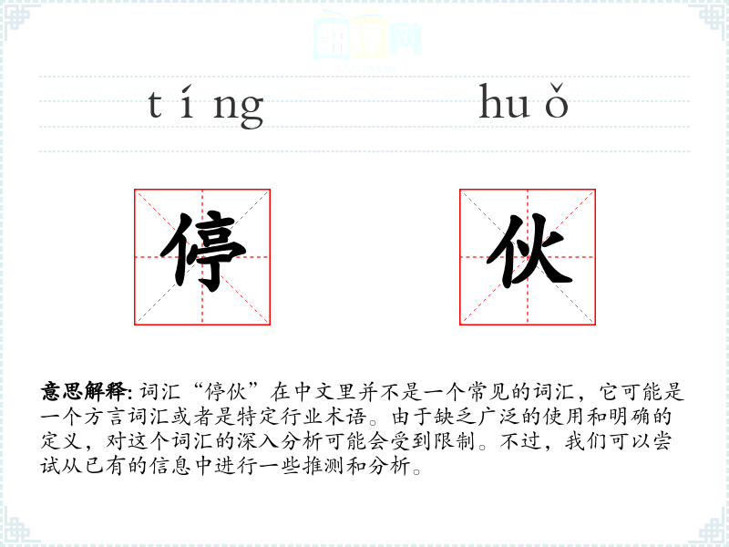 词汇“停伙”在中文里并不是一个常见的词汇,它可能是一个方言词汇或者是特定行业术语。由于缺乏广泛的使用和明确的定义,对这个词汇的深入分析可能会受到限制。不过,我们可以尝试从已有的信息中进行一些推测和分析。