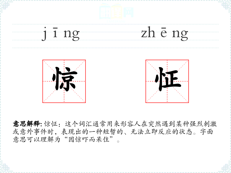 惊怔:这个词汇通常用来形容人在突然遇到某种强烈刺激或意外**时,表现出的一种短暂的、无法立即反应的状态。字面意思可以理解为“因惊吓而呆住”。