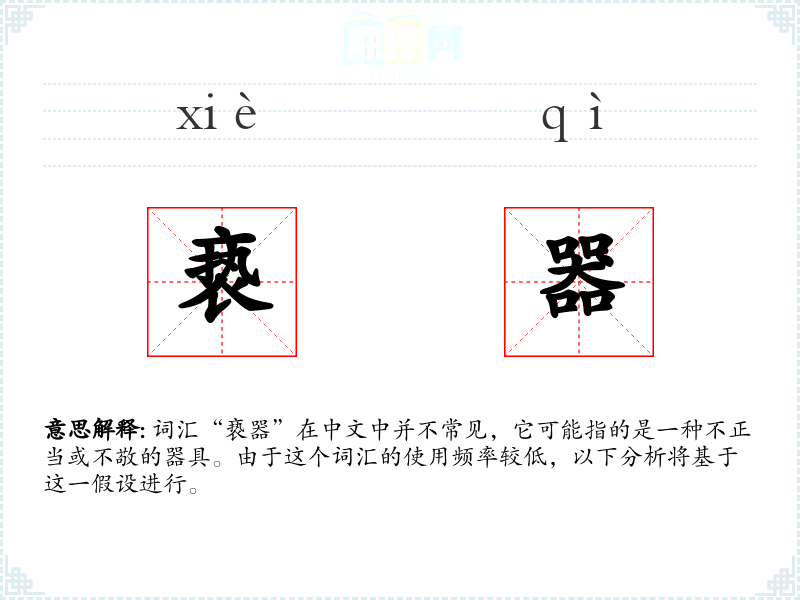 词汇“亵器”在中文中并不常见,它可能指的是一种不正当或不敬的器具。由于这个词汇的使用频率较低,以下分析将基于这一假设进行。
