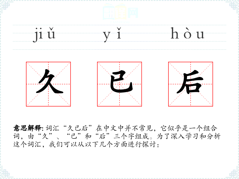 - 由于“久已后”不是一个常用词汇,其词源和演变不太明确。它可能是由常用词汇“久”、“已”和“后”组合而成,用来表达特定的语义。