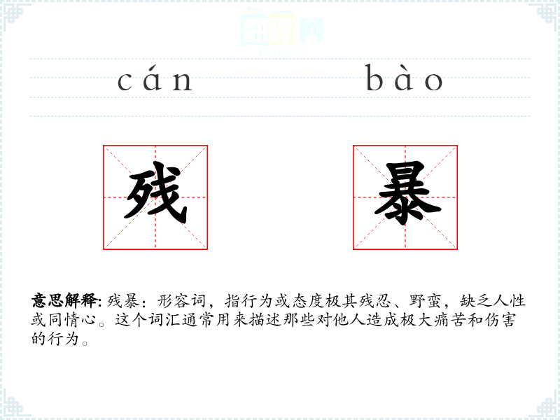 残暴:形容词,指行为或态度极其残忍、野蛮,缺乏人性或同情心。这个词汇通常用来描述那些对他人造成极大痛苦和伤害的行为。