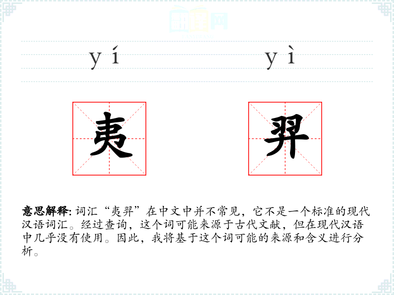词汇“夷羿”在中文中并不常见,它不是一个标准的现代汉语词汇。经过查询,这个词可能来源于古代文献,但在现代汉语中几乎没有使用。因此,我将基于这个词可能的来源和含义进行分析。