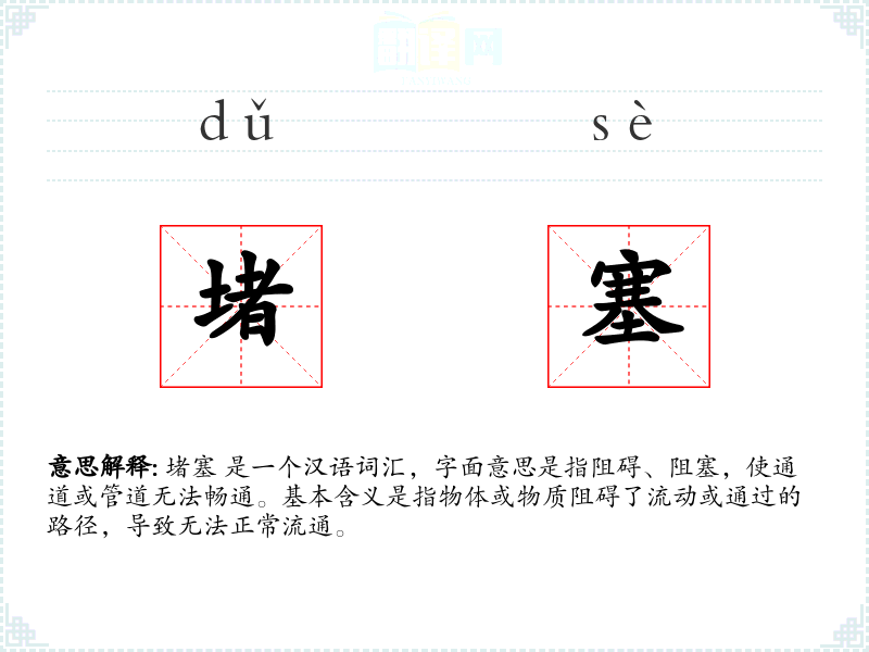 堵塞 是一个汉语词汇,字面意思是指阻碍、阻塞,使通道或管道无法畅通。基本含义是指物体或物质阻碍了流动或通过的路径,导致无法正常流通。