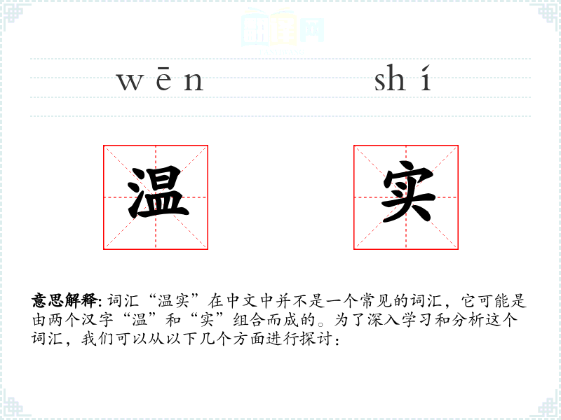 词汇“温实”在中文中并不是一个常见的词汇,它可能是由两个汉字“温”和“实”组合而成的。为了深入学习和分析这个词汇,我们可以从以下几个方面进行探讨: