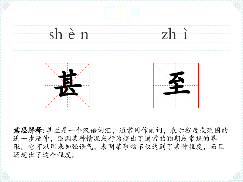 甚至是一个汉语词汇,通常用作副词,表示程度或范围的进一步延伸,强调某种情况或行为超出了通常的预期或常规的界限。它可以用来加强语气,表明某事物不仅达到了某种程度,而且还超出了这个程度。