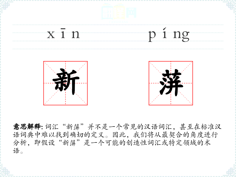 由于“新蓱”不是一个标准词汇,我们无法提供确切的基本定义。如果假设它是一个创造性词汇,它可能由“新”和“蓱”两个字组成。其中,“新”通常表示新鲜、最近出现或更新的意思,而“蓱”在现代汉语中不常用,可能源自古代汉语,意指一种植物或类似的自然元素。