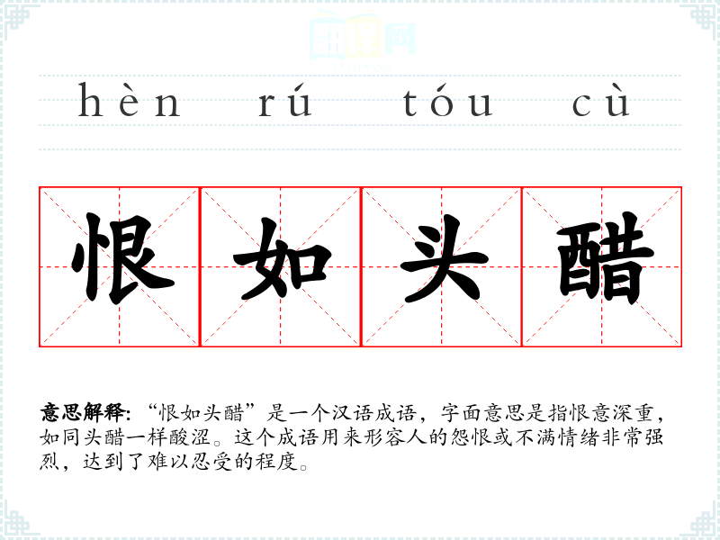 “恨如头醋”是一个汉语成语,字面意思是指恨意深重,如同头醋一样酸涩。这个成语用来形容人的怨恨或不满情绪非常强烈,达到了难以忍受的程度。