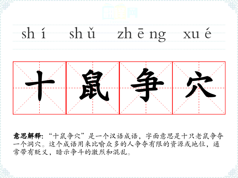 “十鼠争穴”是一个汉语成语,字面意思是十只老鼠争夺一个洞穴。这个成语用来比喻众多的人争夺有限的资源或地位,通常带有贬义,暗示争斗的激烈和混乱。