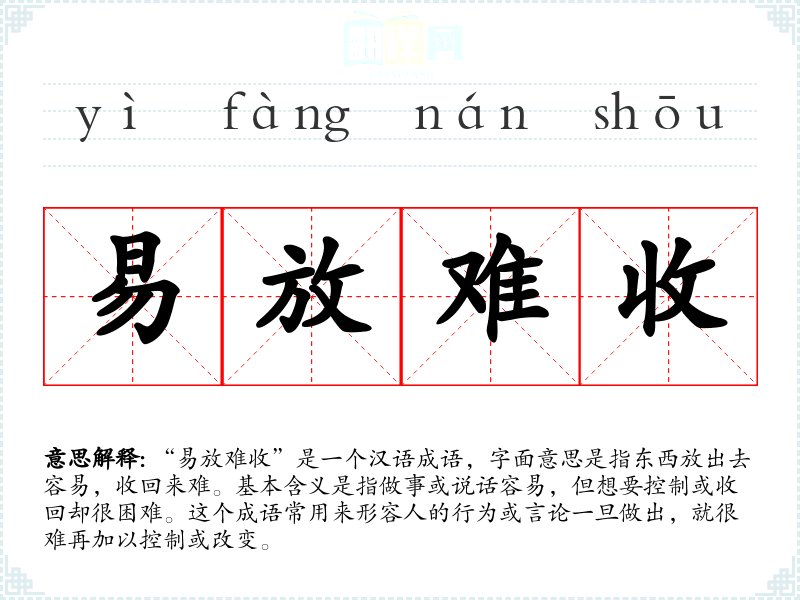 “易放难收”是一个汉语成语,字面意思是指东西放出去容易,收回来难。基本含义是指做事或说话容易,但想要控制或收回却很困难。这个成语常用来形容人的行为或言论一旦做出,就很难再加以控制或改变。