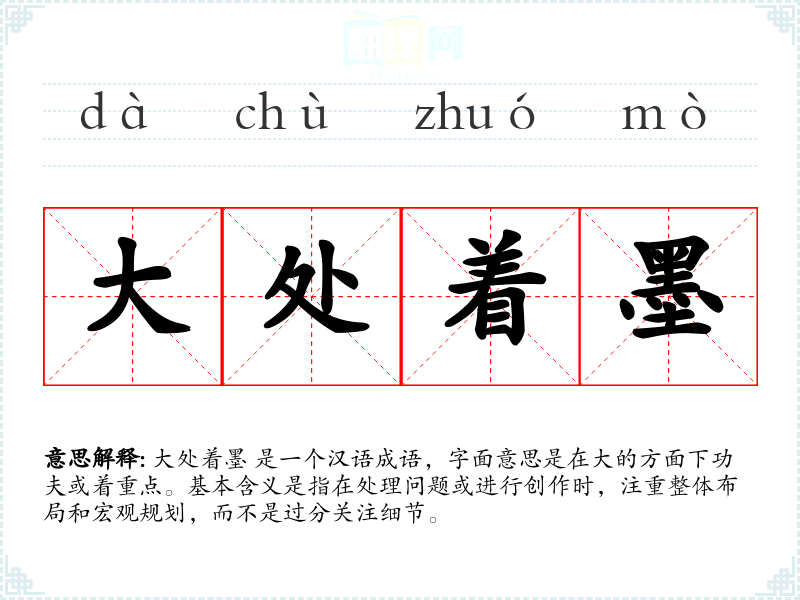大处着墨 是一个汉语成语,字面意思是在大的方面下功夫或着重点。基本含义是指在处理问题或进行创作时,注重整体布局和宏观规划,而不是过分关注细节。