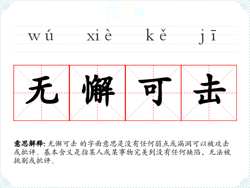 无懈可击 的字面意思是没有任何弱点或漏洞可以被攻击或批评。基本含义是指某人或某事物完美到没有任何缺陷,无法被挑剔或批评。