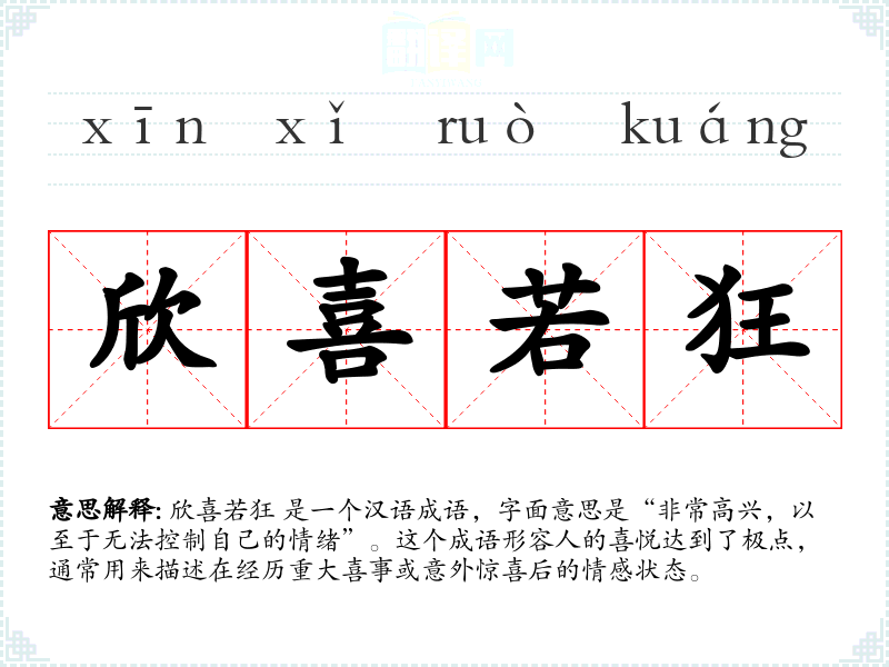 欣喜若狂 是一个汉语成语,字面意思是“非常高兴,以至于无法控制自己的情绪”。这个成语形容人的喜悦达到了极点,通常用来描述在经历重大喜事或意外惊喜后的情感状态。