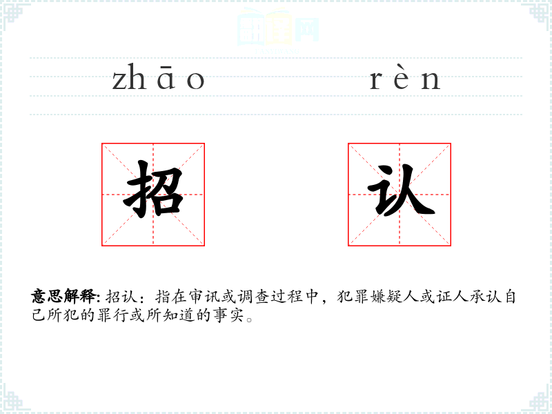 招认:指在审讯或调查过程中,犯罪嫌疑人或证人承认自己所犯的罪行或所知道的事实。