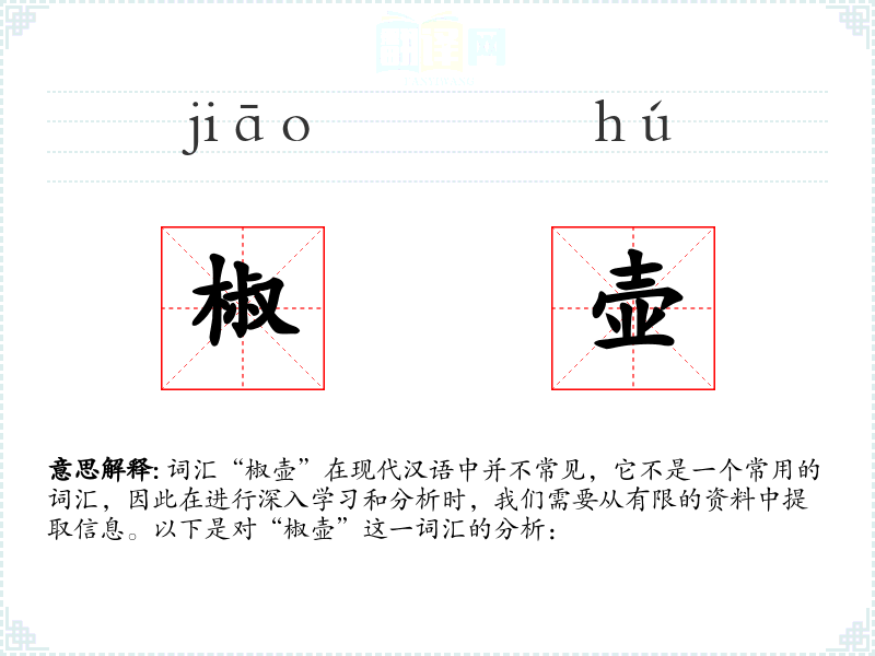 词汇“椒壶”在现代汉语中并不常见,它不是一个常用的词汇,因此在进行深入学*和分析时,我们需要从有限的资料中提取信息。以下是对“椒壶”这一词汇的分析: