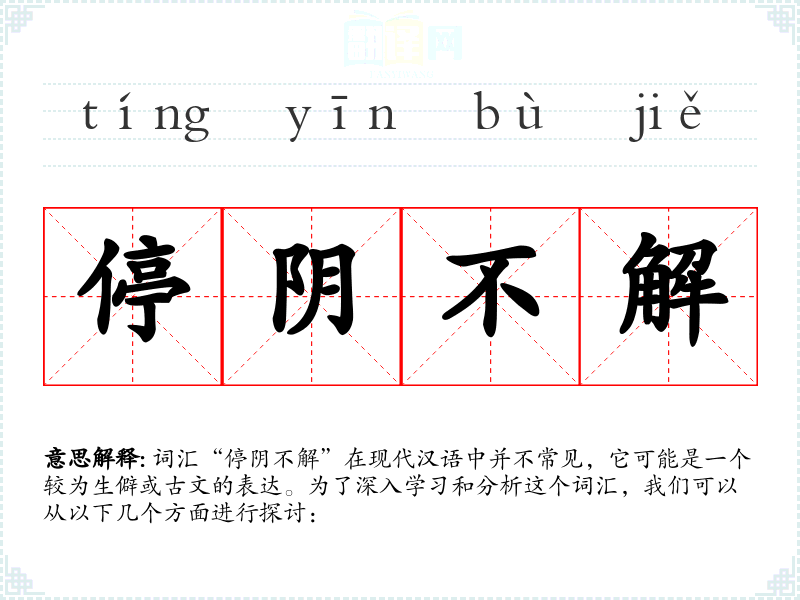 词汇“停阴不解”在现代汉语中并不常见,它可能是一个较为生僻或古文的表达。为了深入学*和分析这个词汇,我们可以从以下几个方面进行探讨: