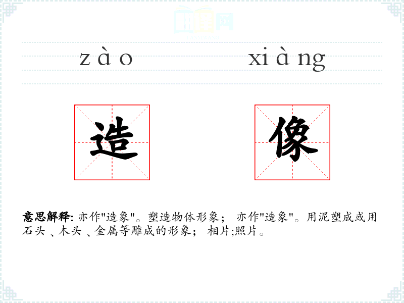 亦作"造象"。塑造物体形象; 亦作"造象"。用泥塑成或用石头﹑木头﹑金属等雕成的形象; 相片;照片。