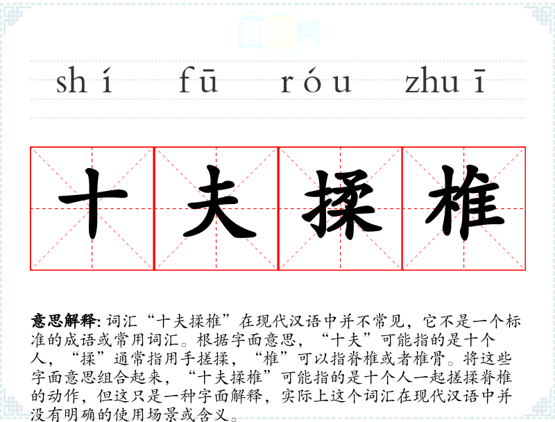 文化与社会背景: 由于“十夫揉椎”不是一个常用词汇,它在特定文化或社会背景中的意义和影响也非常有限。