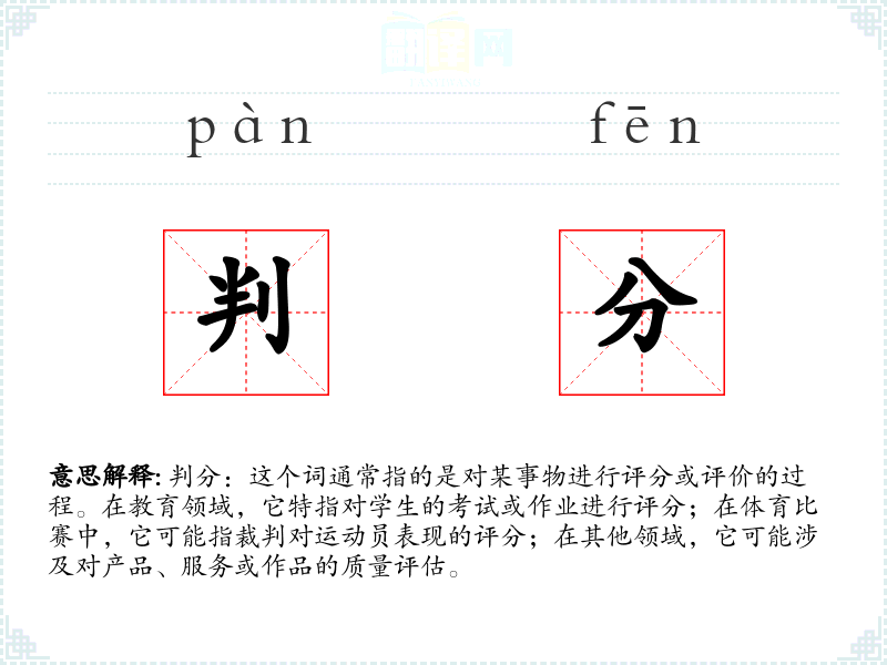 判分一词源于汉语,由“判”和“分”两个字组成。“判”字古已有之,意为判断、裁决;“分”字则指分开、分配。两者结合,形成了现代汉语中的“判分”一词,用以描述评价和分配分数的过程。