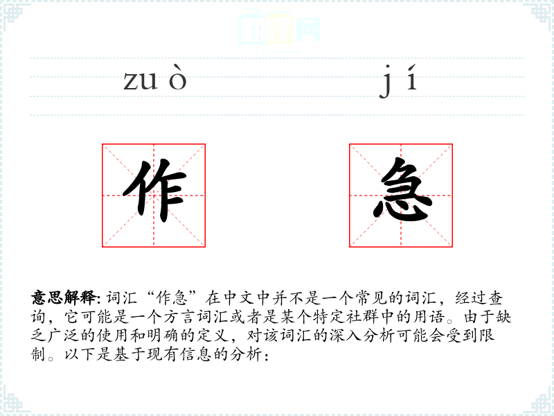 由于“作急”不是一个常见词汇,对其的理解和应用可能需要特定的语境和创造性的解释。在语言学习和表达中,了解和尊重不同方言和社群的用语是非常重要的。