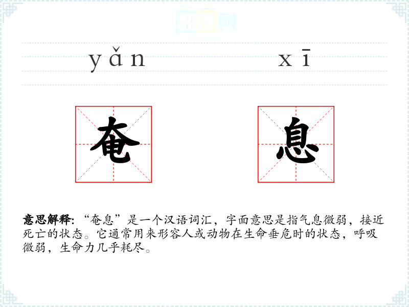 “奄息”是一个汉语词汇,字面意思是指气息微弱,接近死亡的状态。它通常用来形容人或动物在生命垂危时的状态,呼吸微弱,生命力几乎耗尽。