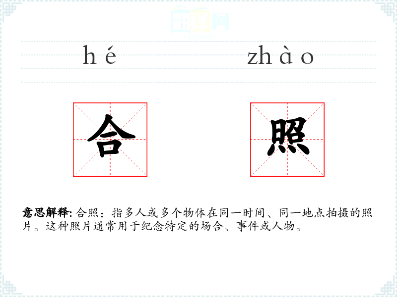 合照一词由“合”和“照”两个字组成。“合”意味着结合、聚集,“照”则指照片。这个词在中文中的使用历史相对较短,随着摄影技术的发展而逐渐普及。