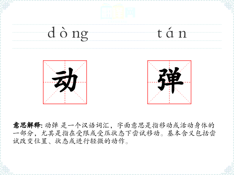 动弹 是一个汉语词汇,字面意思是指移动或活动身体的一部分,尤其是指在受限或受压状态下尝试移动。基本含义包括尝试改变位置、状态或进行轻微的动作。