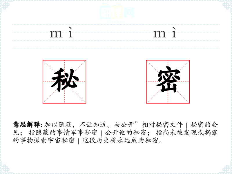 加以隐蔽,不让知道。与公开”相对秘密文件|秘密的会见; 指隐蔽的事情军事秘密|公开他的秘密; 指尚未被发现或揭露的事物探索宇宙秘密|这段历史将永远成为秘密。