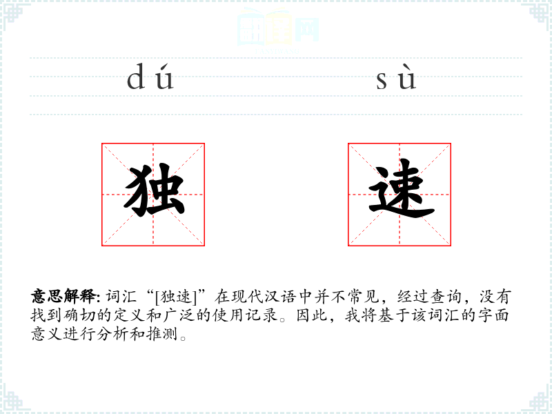 词汇“[独速]”在现代汉语中并不常见,经过查询,没有找到确切的定义和广泛的使用记录。因此,我将基于该词汇的字面意义进行分析和推测。