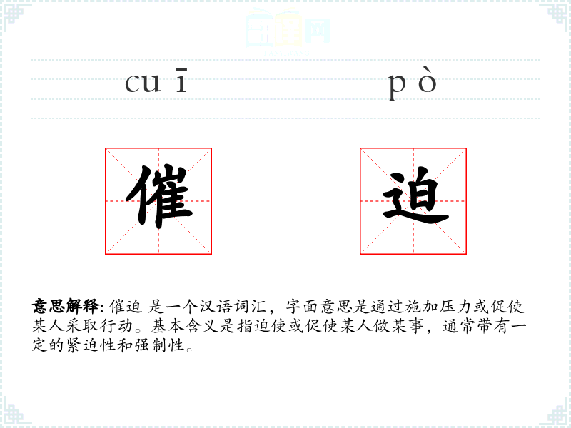 “催迫”一词的词源较为直接,由“催”和“迫”两个字组成,分别表示促使和压迫。在古代汉语中,这两个字常单独使用,现代汉语中结合使用,强调了促使和压迫的双重含义。