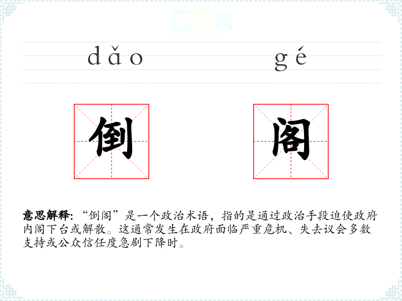 “倒阁”是一个政治术语,指的是通过政治手段迫使政府内阁下台或解散。这通常发生在政府面临严重危机、失去议会多数支持或公众信任度急剧下降时。