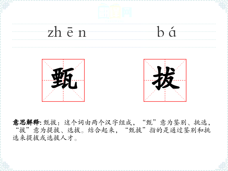 甄拔:这个词由两个汉字组成,“甄”意为鉴别、挑选,“拔”意为提拔、选拔。结合起来,“甄拔”指的是通过鉴别和挑选来提拔或选拔人才。