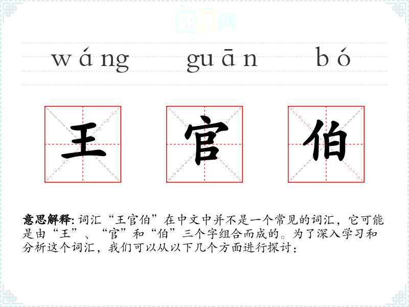 - “王官伯”是一个具有特定历史和文化背景的词汇,对于理解*古代社会结构和官职体系具有重要意义。在学中文和了解**历史文化时,这个词汇可以作为一个有价值的知识点。