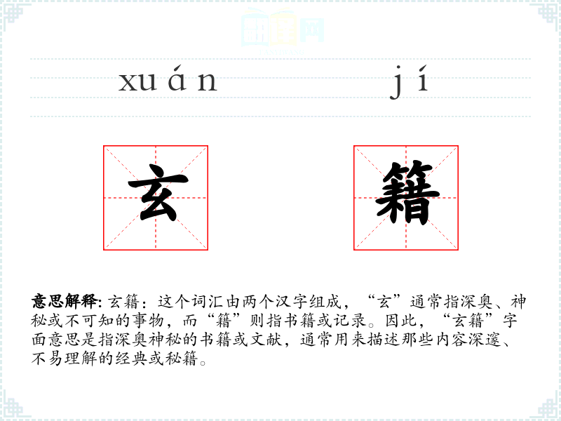 玄籍:这个词汇由两个汉字组成,“玄”通常指深奥、神秘或不可知的事物,而“籍”则指书籍或记录。因此,“玄籍”字面意思是指深奥神秘的书籍或文献,通常用来描述那些内容深邃、不易理解的经典或秘籍。