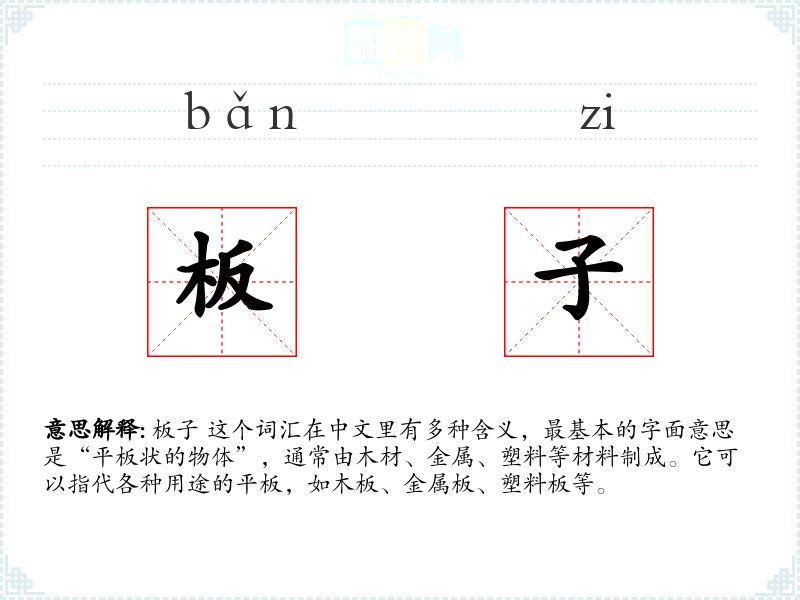 板子 这个词汇在中文里有多种含义,最基本的字面意思是“平板状的物体”,通常由木材、金属、塑料等材料制成。它可以指代各种用途的平板,如木板、金属板、塑料板等。