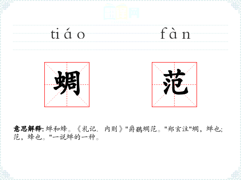 蝉和蜂。《礼记.内则》"爵鷃蜩范。"郑玄注"蜩,蝉也;范,蜂也。"一说蝉的一种。