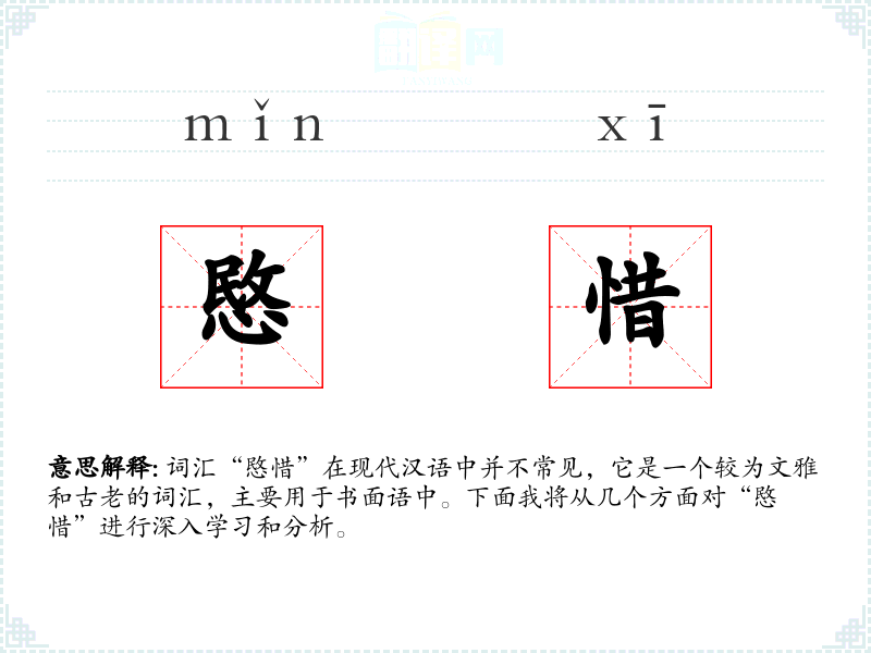 词汇“愍惜”在现代汉语中并不常见,它是一个较为文雅和古老的词汇,主要用于书面语中。下面我将从几个方面对“愍惜”进行深入学*和分析。