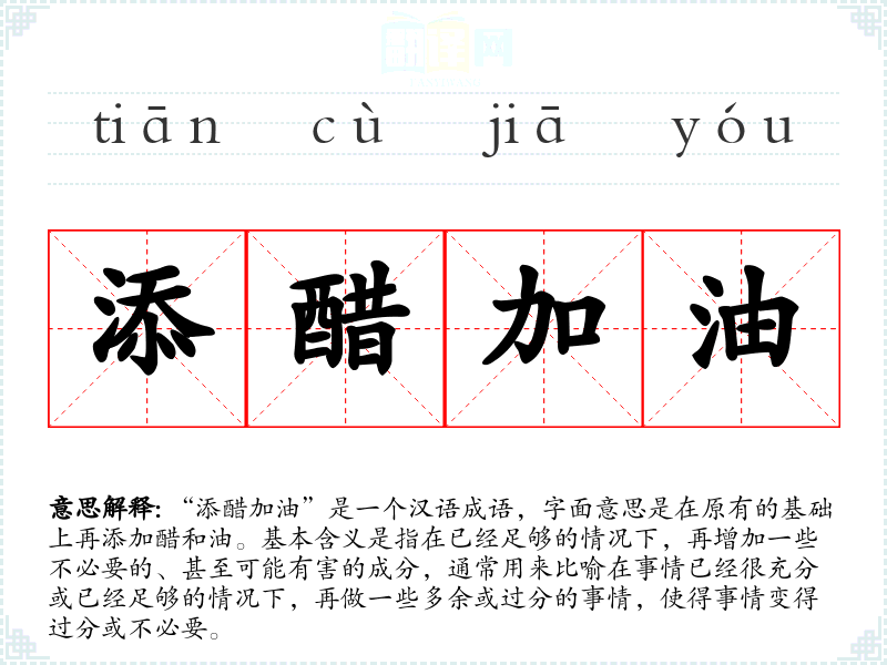 “添醋加油”是一个汉语成语,字面意思是在原有的基础上再添加醋和油。基本含义是指在已经足够的情况下,再增加一些不必要的、甚至可能有害的成分,通常用来比喻在事情已经很充分或已经足够的情况下,再做一些多余或过分的事情,使得事情变得过分或不必要。