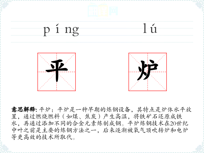- 反义词:与平炉相对的现代炼钢技术包括“氧气顶吹转炉”和“电炉”,这些可以视为平炉的反义词。