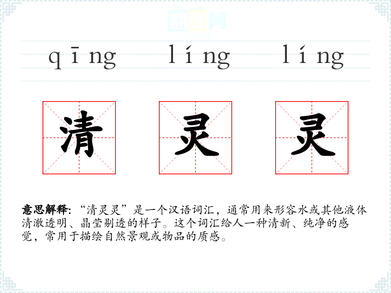 “清灵灵”这个词汇的词源较为简单,由“清”和“灵灵”组成。其中,“清”表示清澈、纯净,“灵灵”则加强了这种清澈的感觉,使其更加生动。在汉语中,这种重复使用形容词的方式并不少见,用以增强表达效果。