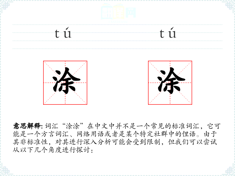 “涂涂”作为一个非标准词汇,其含义和用法可能受到特定语境的限制。在语言学习和表达中,了解和掌握这样的词汇可以帮助我们更好地理解特定社群的文化和语言习惯。