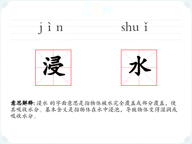 “浸水”一词由“浸”和“水”两个字组成。“浸”字古汉语中已有,意为浸泡;“水”字则是最基本的表示水的词汇。随着语言的发展,“浸水”逐渐成为描述物体被水浸泡的常用词汇。
