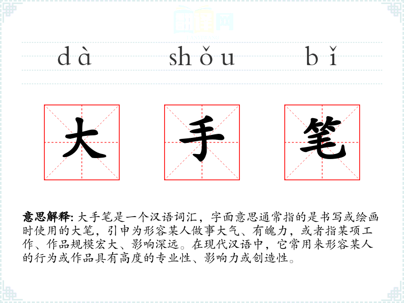 大手笔是一个汉语词汇,字面意思通常指的是书写或绘画时使用的大笔,引申为形容某人做事大气、有魄力,或者指某项工作、作品规模宏大、影响深远。在现代汉语中,它常用来形容某人的行为或作品具有高度的专业性、影响力或创造性。