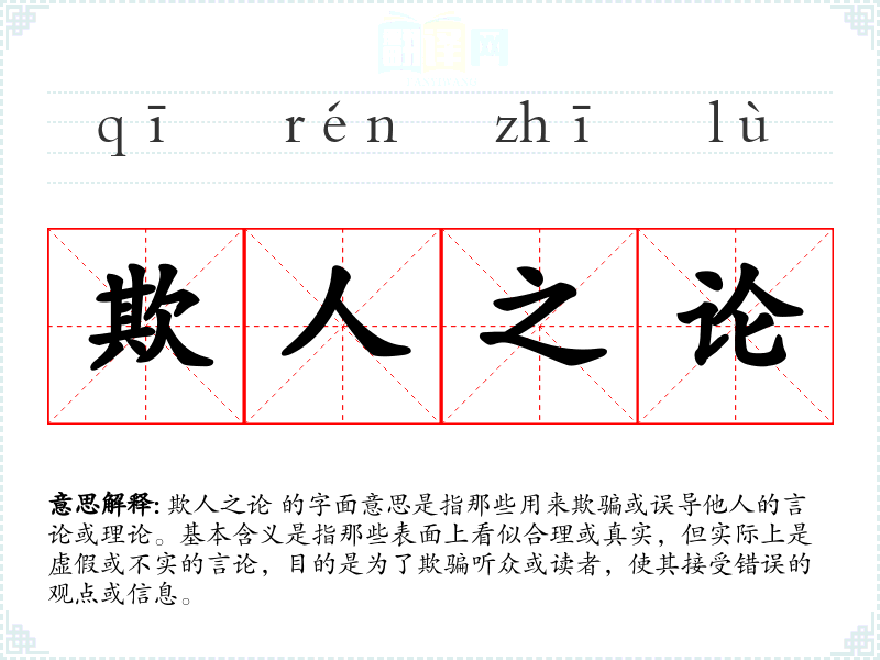 欺人之论 的字面意思是指那些用来欺骗或误导他人的言论或理论。基本含义是指那些表面上看似合理或真实,但实际上是虚假或不实的言论,目的是为了欺骗听众或读者,使其接受错误的观点或信息。
