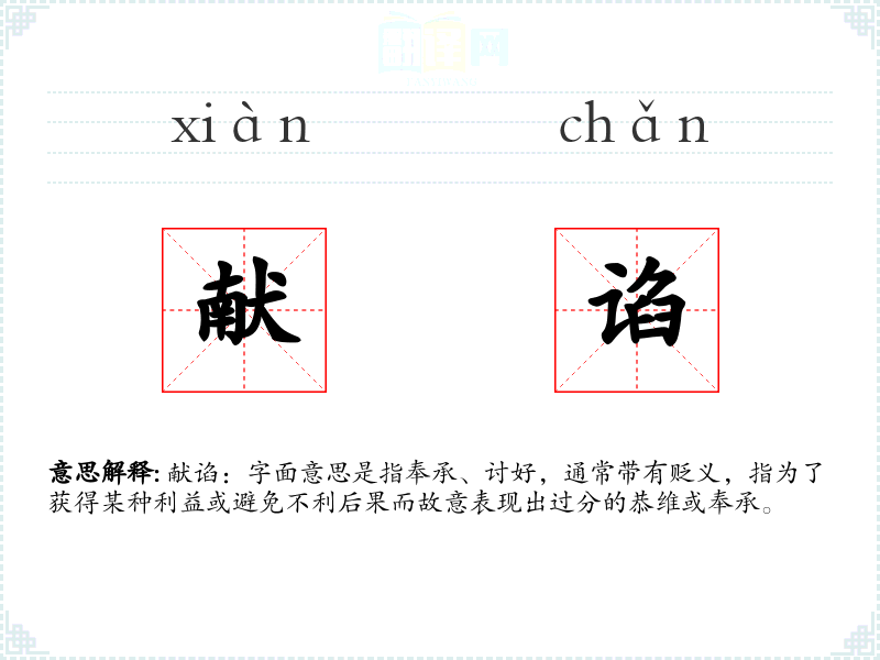 献谄:字面意思是指奉承、讨好,通常带有贬义,指为了获得某种利益或避免不利后果而故意表现出过分的恭维或奉承。