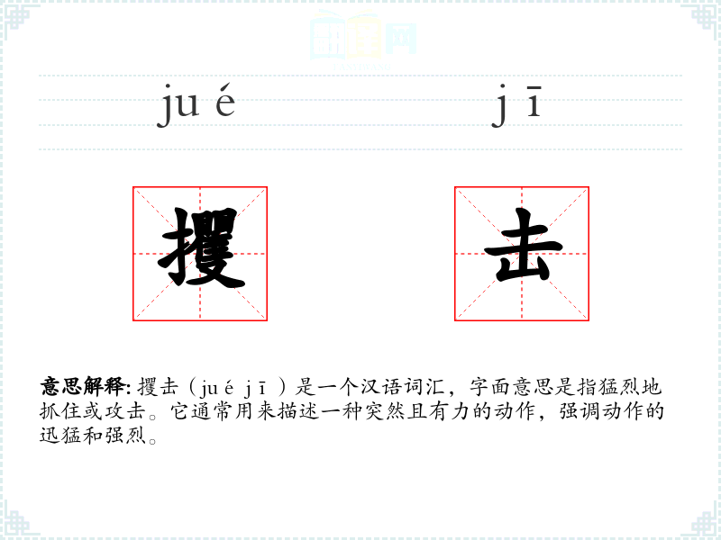 攫击(jué jī)是一个汉语词汇,字面意思是指猛烈地抓住或攻击。它通常用来描述一种突然且有力的动作,强调动作的迅猛和强烈。