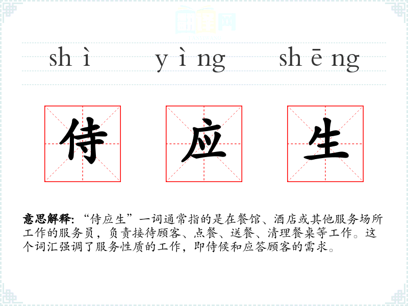 “侍应生”一词通常指的是在餐馆、酒店或其他服务场所工作的服务员,负责接待顾客、点餐、送餐、清理餐桌等工作。这个词汇强调了服务性质的工作,即侍候和应答顾客的需求。