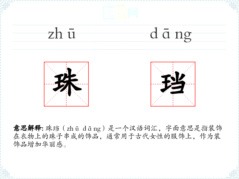 珠珰(zhū dāng)是一个汉语词汇,字面意思是指装饰在衣物上的珠子串成的饰品,通常用于古代女性的服饰上,作为装饰品增加华丽感。