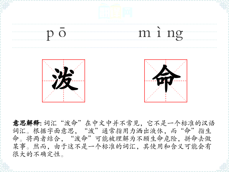 词汇“泼命”在中文中并不常见,它不是一个标准的汉语词汇。根据字面意思,“泼”通常指用力洒出液体,而“命”指生命。将两者结合,“泼命”可能被理解为不顾生命危险,拼命去做某事。然而,由于这不是一个标准的词汇,其使用和含义可能会有很大的不确定性。