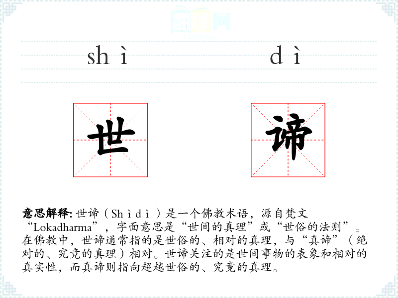 世谛(Shìdì)是一个术语,源自梵文“Lokadharma”,字面意思是“世间的真理”或“世俗的法则”。在中,世谛通常指的是世俗的、相对的真理,与“真谛”(绝对的、究竟的真理)相对。世谛关注的是世间事物的表象和相对的真实性,而真谛则指向超越世俗的、究竟的真理。